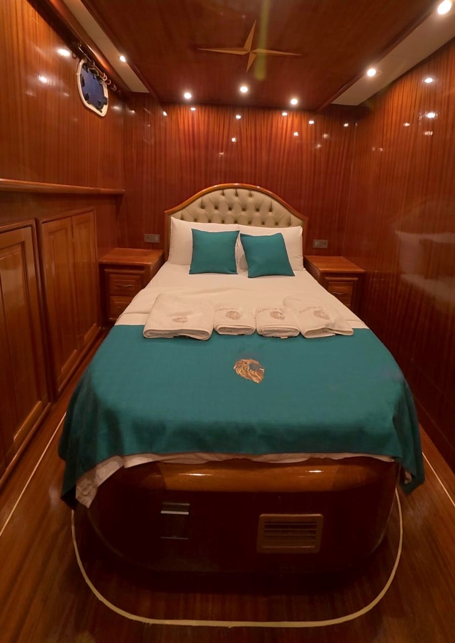 2 master, 2 triple ve 2 double olmak üzere toplam 6 kabin bulunmaktadır. Yolcu kapasitesi Türk sularında 12, Yabancı karasularında 12 kişidir. Her kabinde; Klima, duşa kabinli banyo, ev tipi tuvalet, banyo ve el havluları mevcuttur.