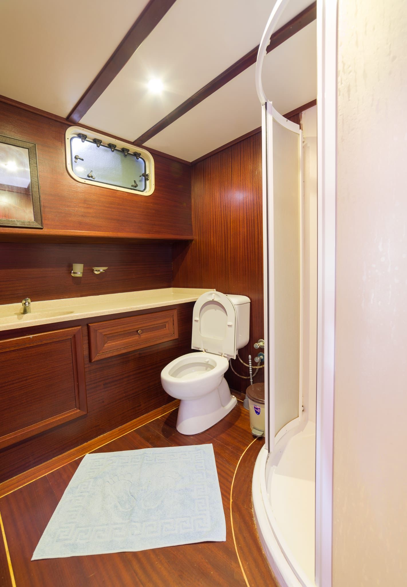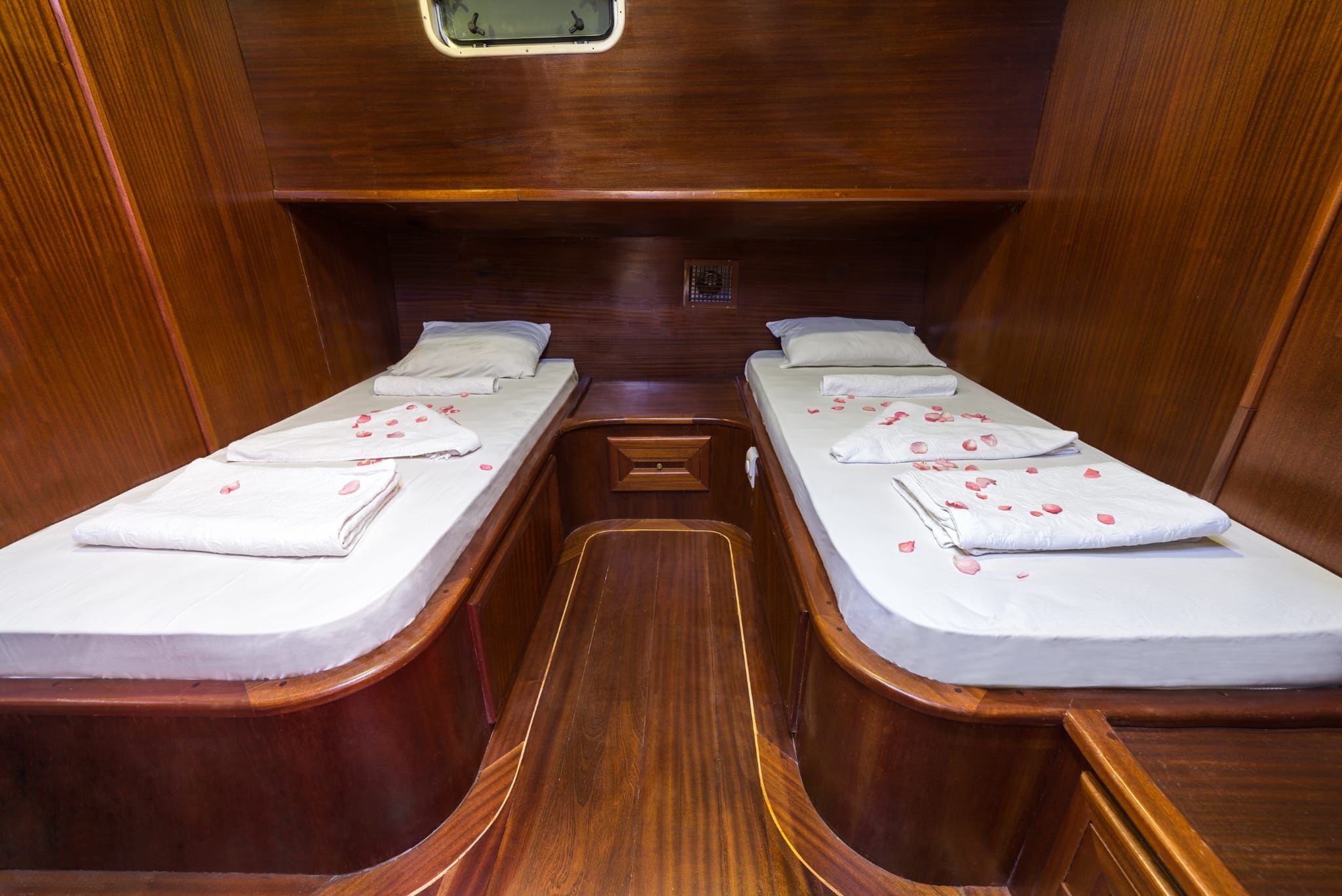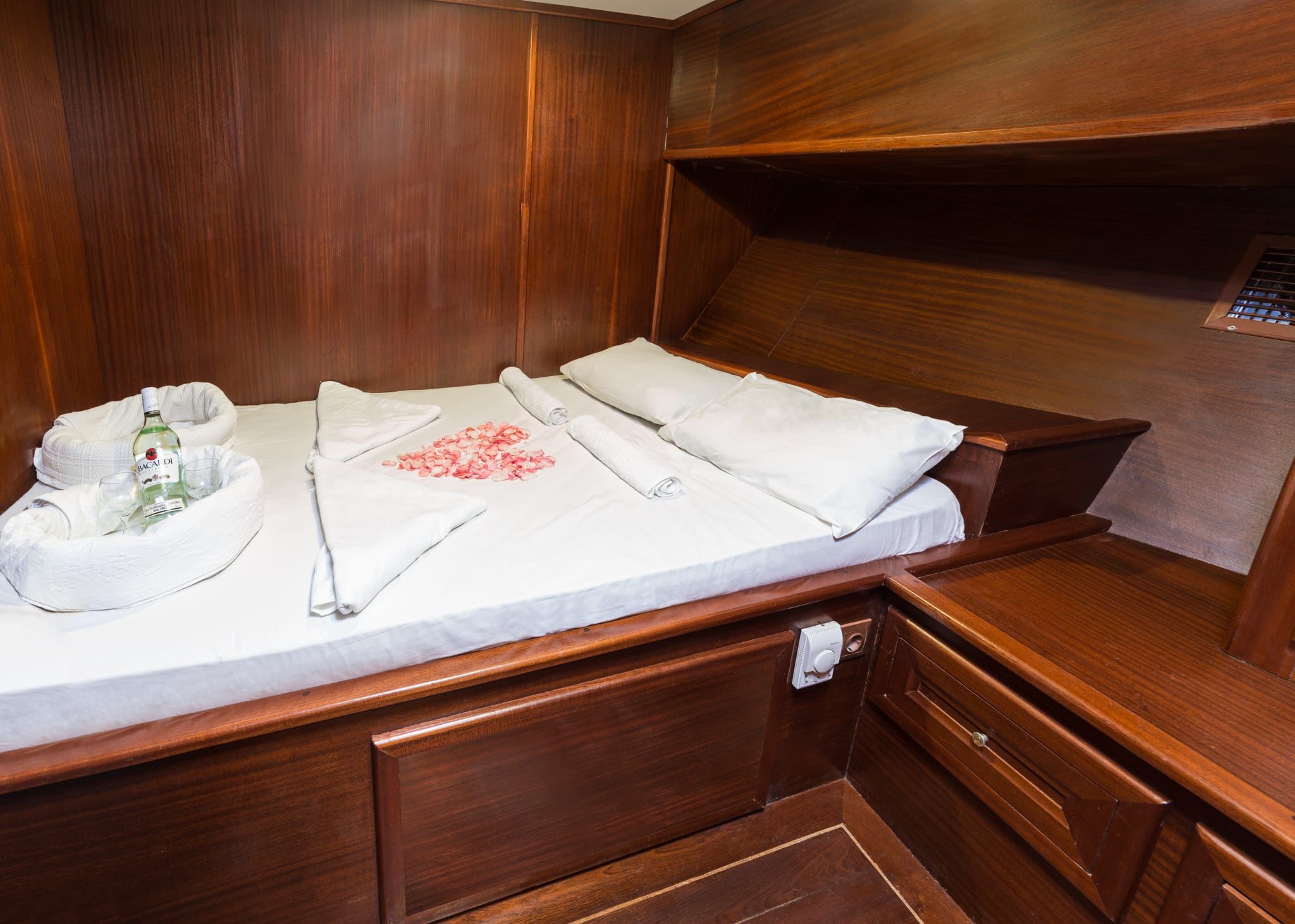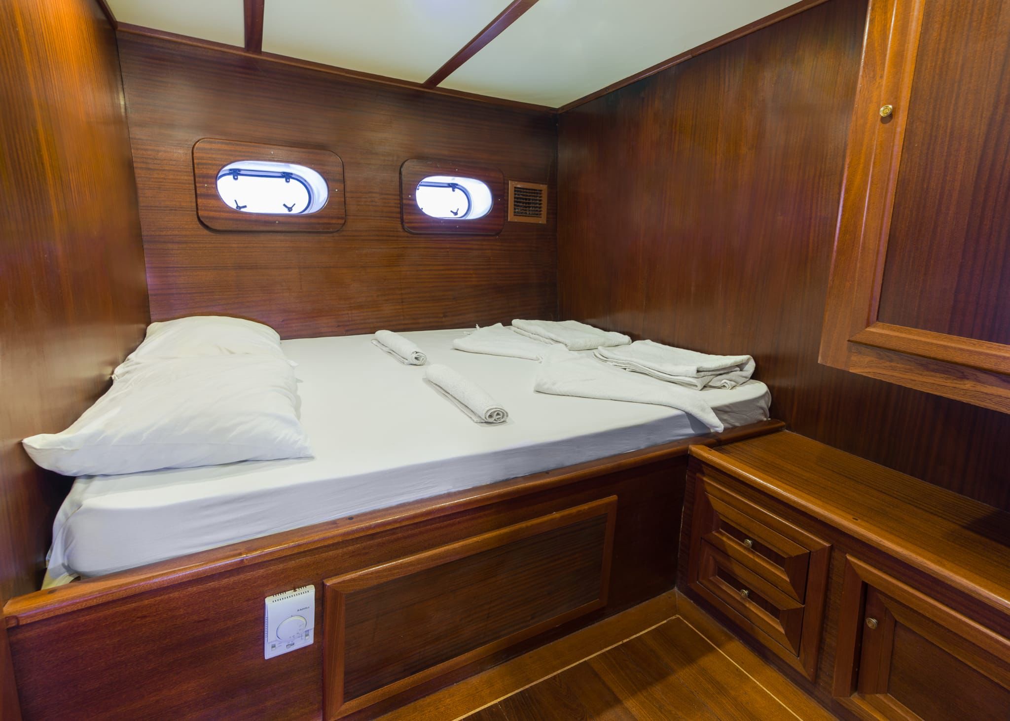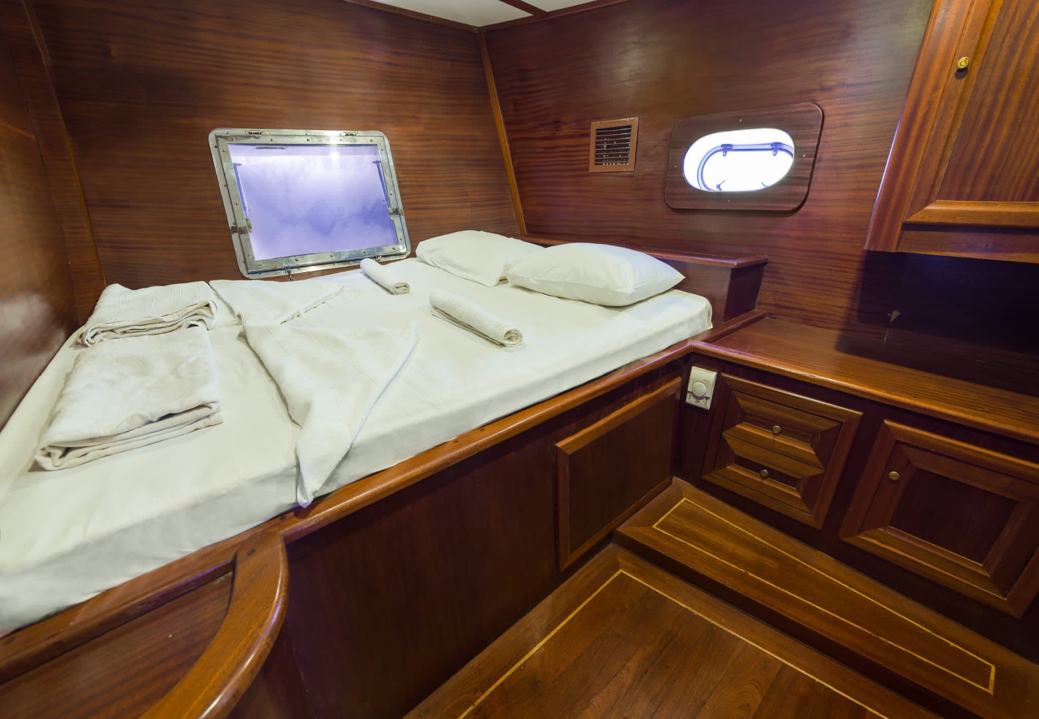 5 double 2 twin olmak üzere toplam 7 kabin bulunmaktadır. Yolcu kapasitesi Türk sularında 14, Yabancı karasularında 12 kişidir. Kabinlerde; Klima, Duşa kabinli banyo, ev tipi tuvalet ve el ve ayak havluları mevcuttur.