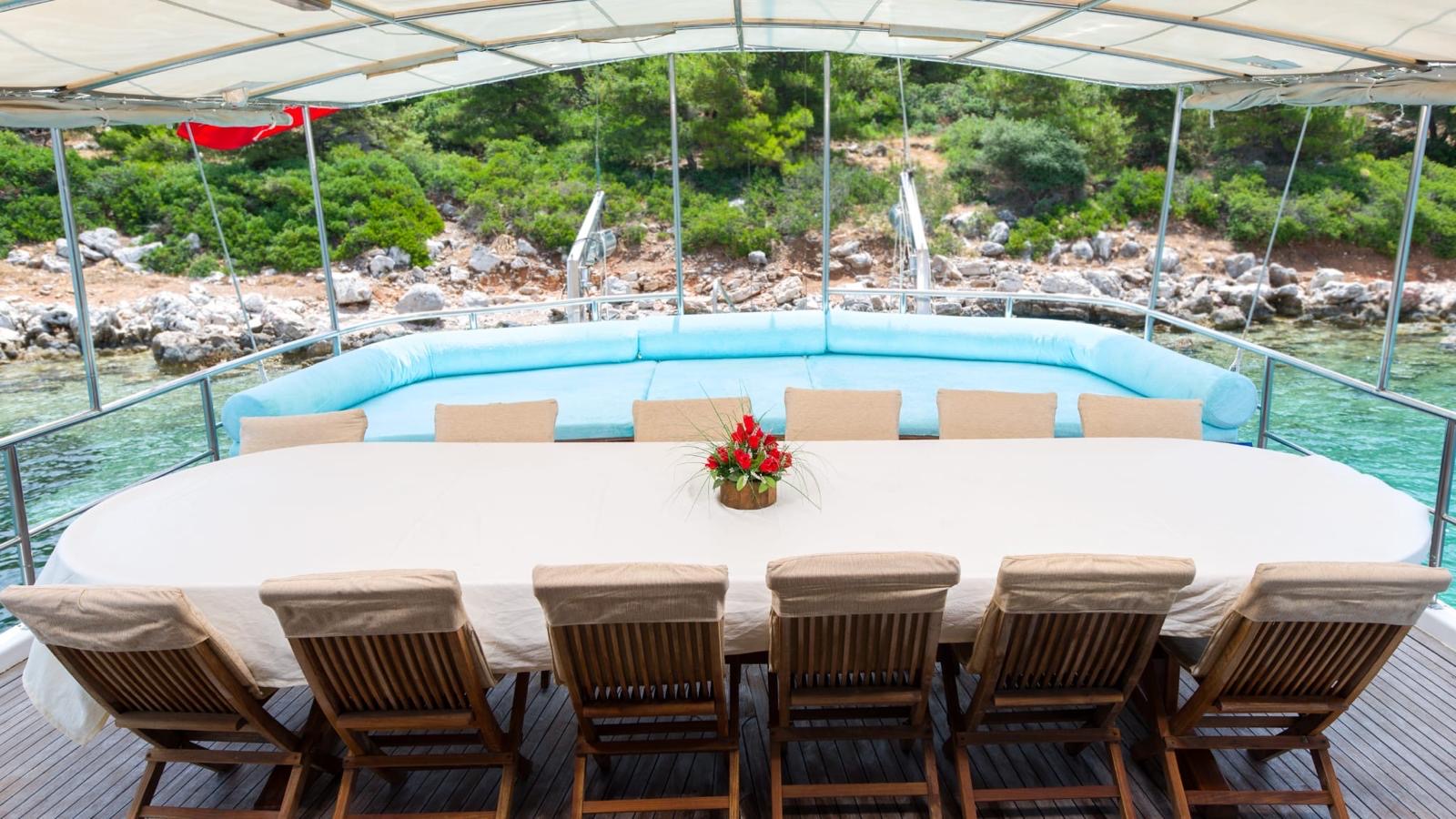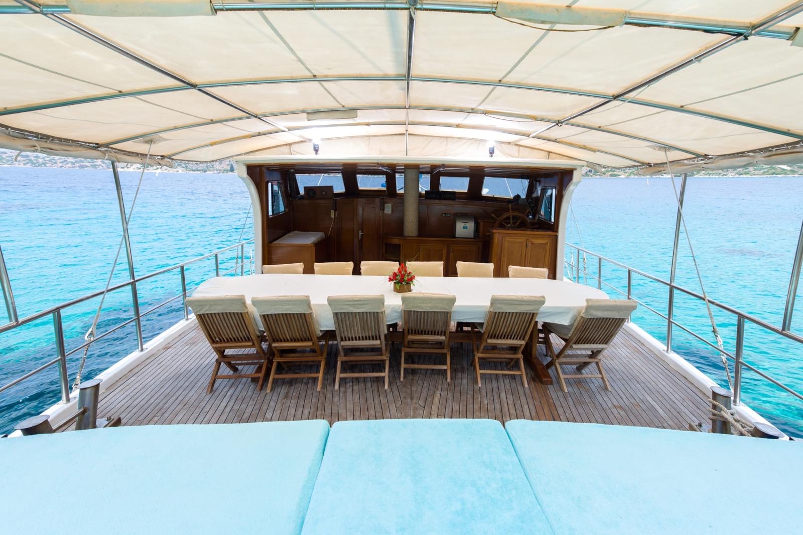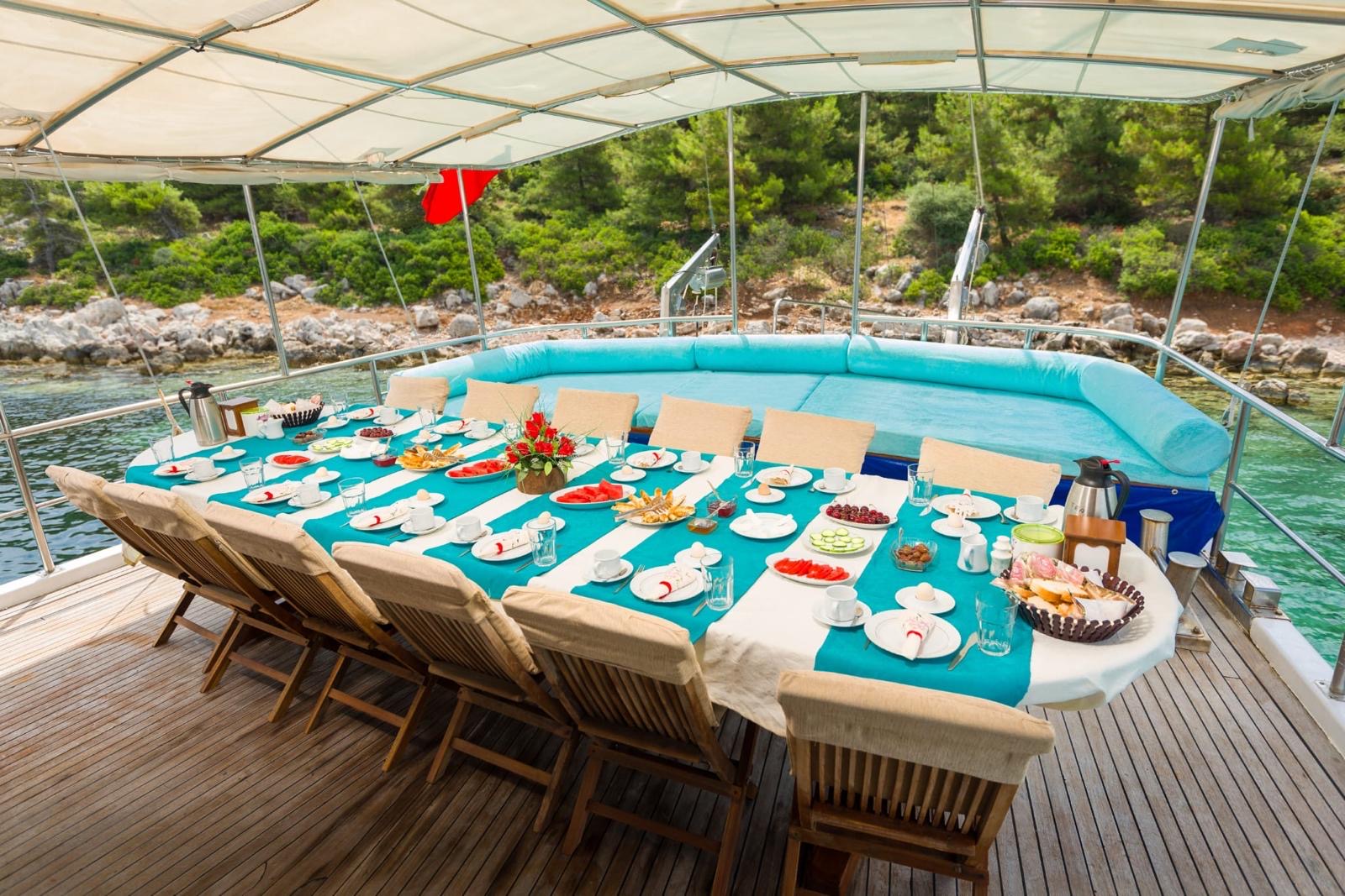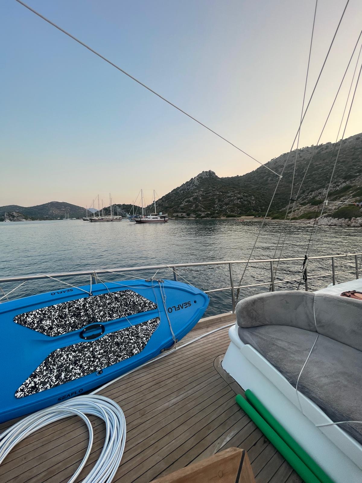 Yatımızda; Yemek masası, güneşlenme alanları ve yeterli oturma alanları, oturma gurubu, müzik sistemi, kano ve paddle board vardır.